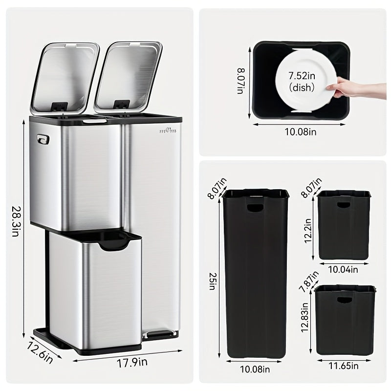 Mvm 9.5\u002F16 Gal 3 in 1 Kitchen Step Trash Can with Soft Close Lid, Duty Anti Fingerprint Brushed Recycling Bin for Office Home Markets, Stainless Garbage Bin, with 3 Removable Inner Barrels, Ideal for Wet Dry Waste Sorting