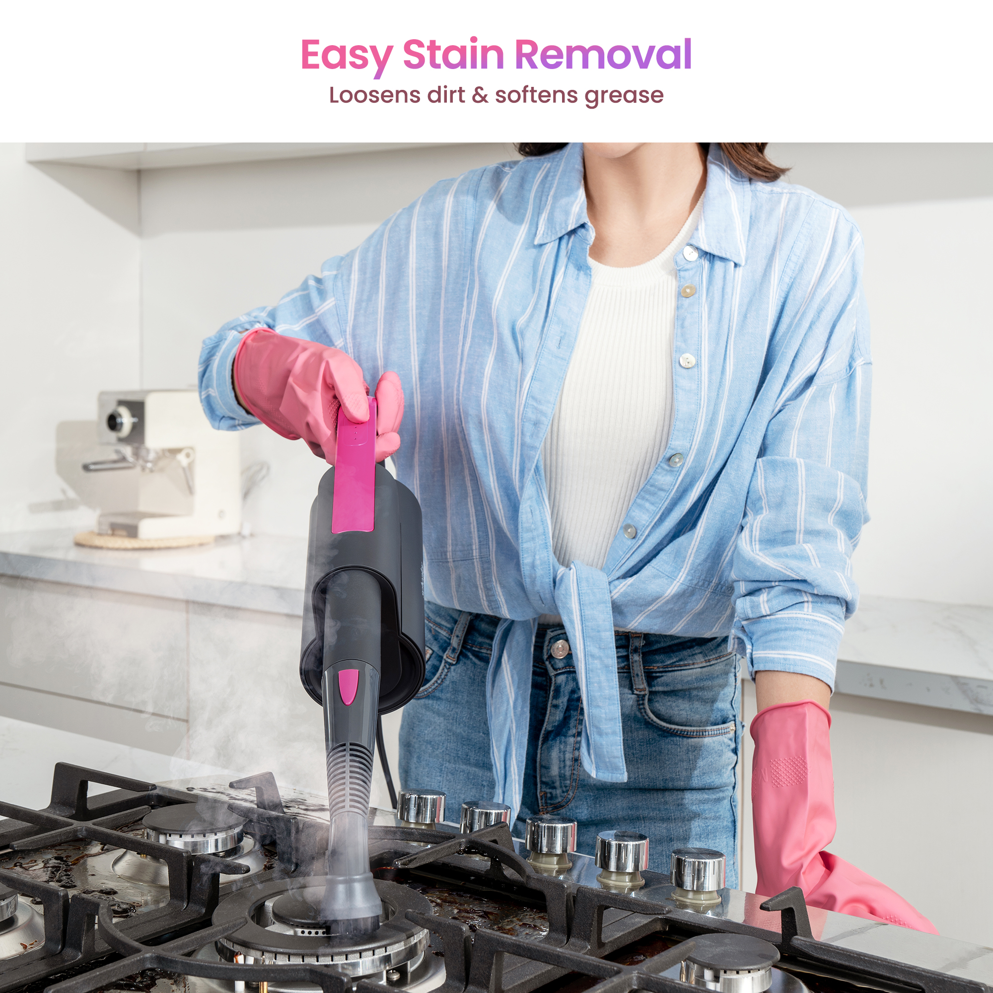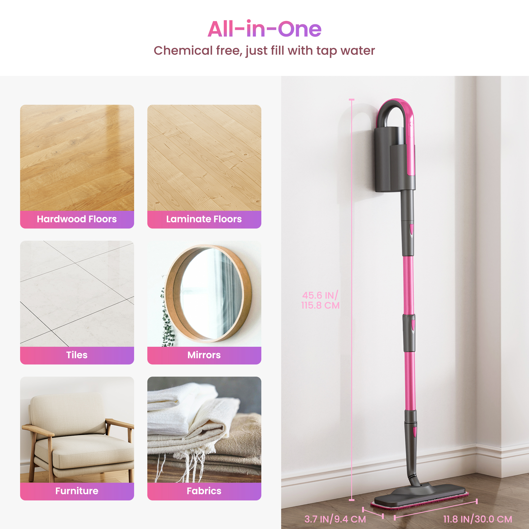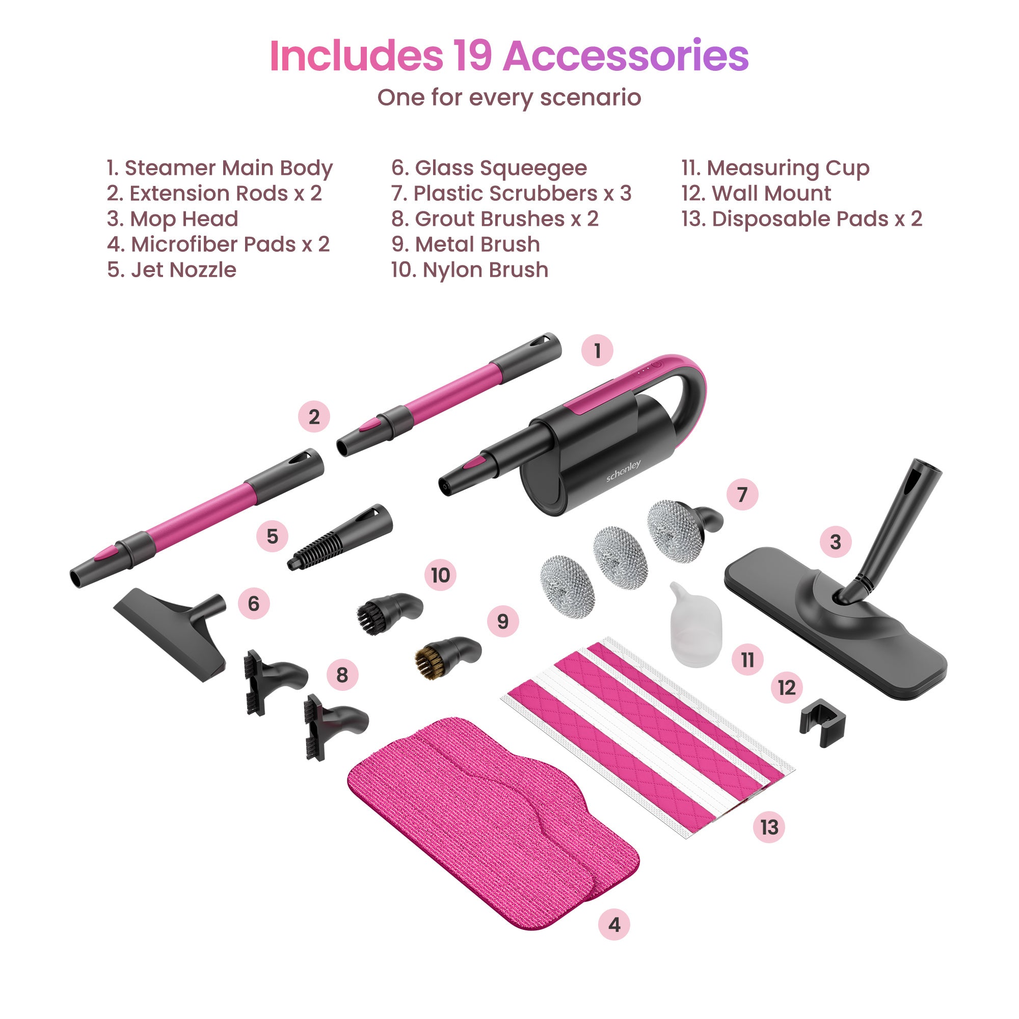 Multi-Purpose Cleaning with 19-in-1 Accessories Tackle a variety of cleaning tasks with our comprehensive set of 19-in-1 accessories and washable microfiber pads. From kitchens and bathrooms to living rooms. this steam mop is great for dealing with sticky/greasy messes and stubborn stains on walls. hard floors. tiles. windows. grouts. and stoves.